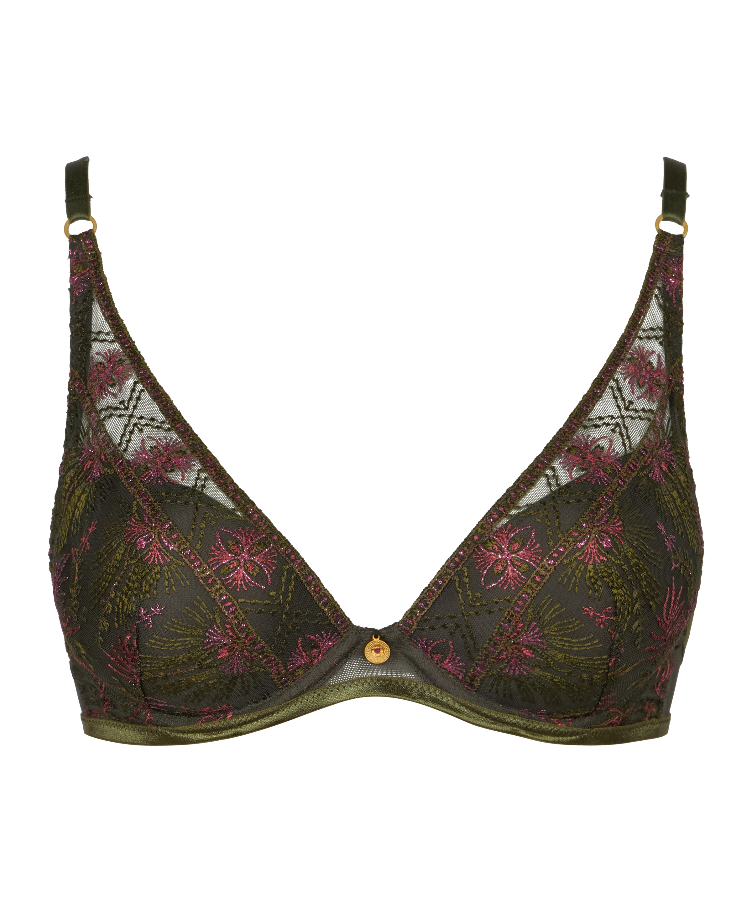 Voorgevormde bh (Sound of Heart) – push-upmodel met rijk geborduurde randen en lurex, voorzien van een goudkleurig accent. Ontworpen voor extra lift en verleidelijk decolleté.