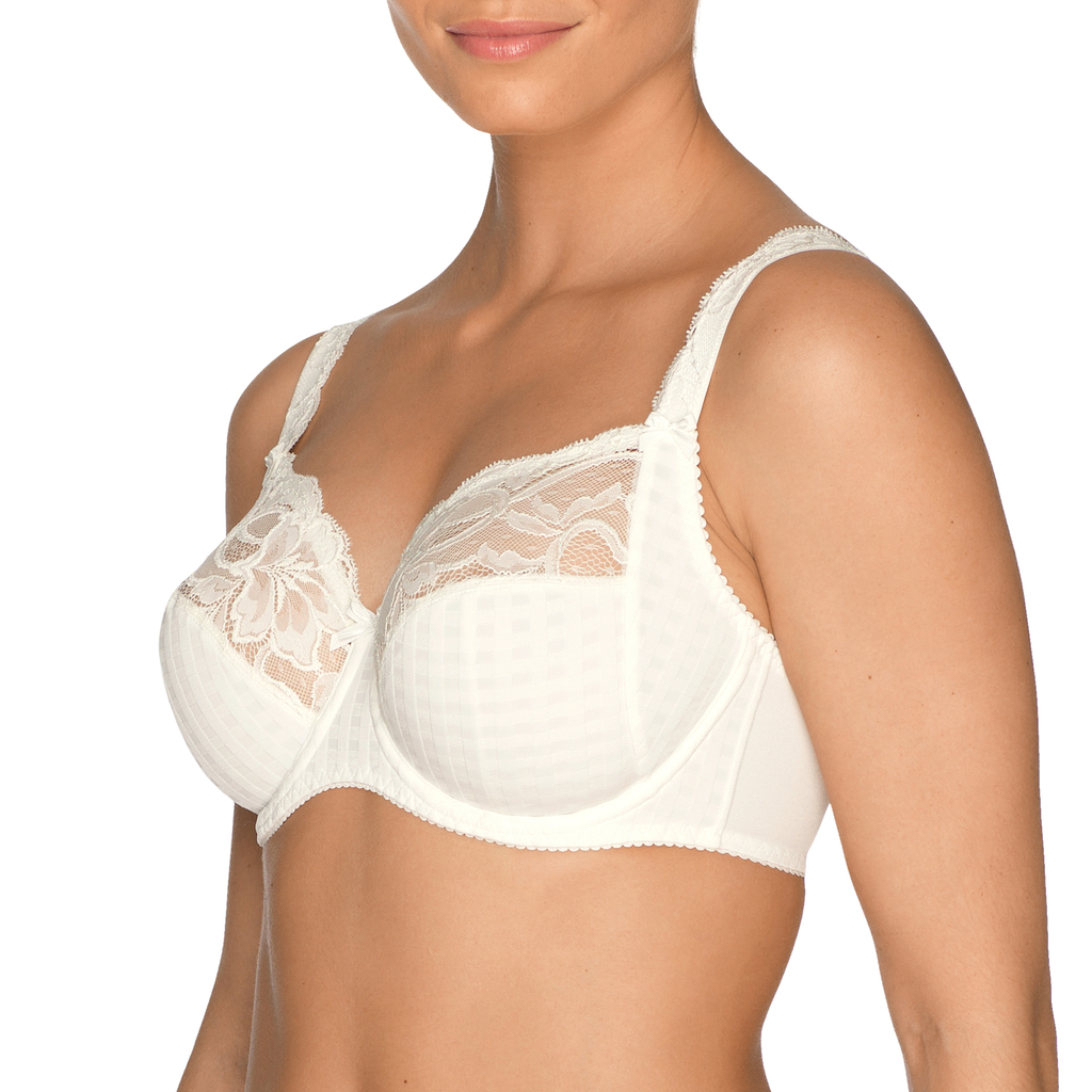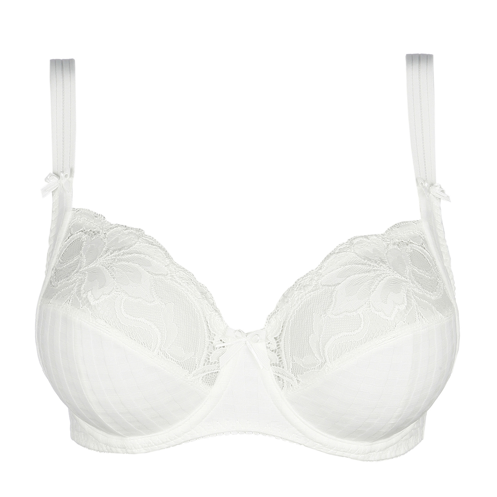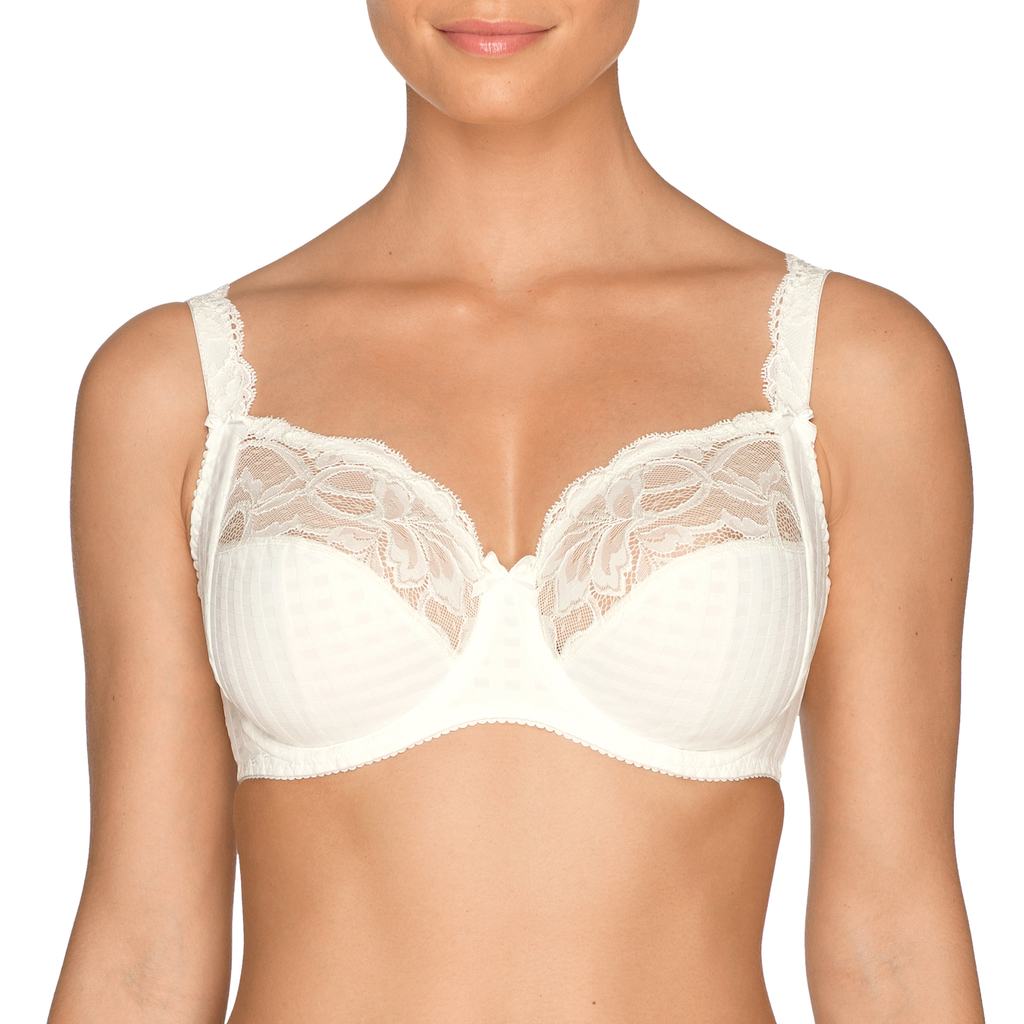 De PrimaDonna Madison beugel BH heeft driedelige cups die de borsten een voorwaartse lift geven, waardoor je slanker lijkt. De bovenkant van de cups zijn gemaakt van luxe, elastisch kant voor optimaal draagcomfort. Tussen de cups en op de schouderbandjes zijn strikjes bevestigd. De Madison is erg populair onder PrimaDonna fans. De combinatie van ruitjes en kant geeft deze serie een jonge en elegante uitstraling. Deze bh is verkrijgbaar in natuur, zwart, huidskleur, rood en wit.
